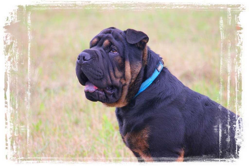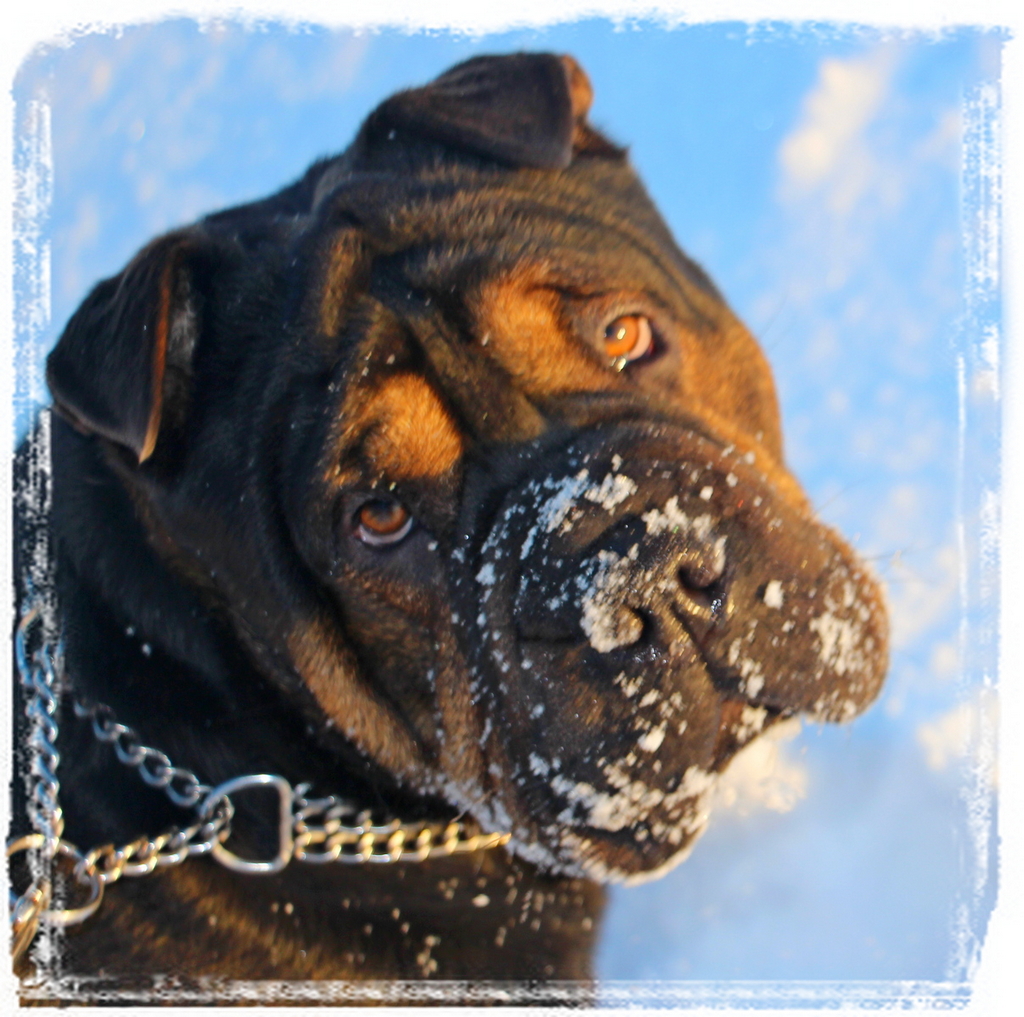 Ich bin Bodyguard. Und ich bin Bull-Pei Nummer zwei. Ich bin ein Jahr alt und ein kleiner Bandit, ein Mix aus Englischer Bulldogge und Shar Pei. Ich komme aus Sachsen und wohne in Brandenburg, fahre aber jeden Tag zur Arbeit nach Berlin! Frauchen denkt, ich wäre ein Jack Russel. Ich werde nie müde! Ich kann den ganzen Tag lang toben und Party machen! Ich kann gut schwimmen. Ich springe wie eine Känguru! Ich habe eine sehr gute Nase und einen ausgeprägten Jagdinstinkt. Ich bin ein guter Wachhund und lasse niemanden ohne Erlaubnis meines Frauchen in den Garten. Mein Frauchen ist sehr anstrengend und wir haben oft Meinungsverschiedenheiten … und meistens (eigentlich immer) muss ich nachgeben! Unsere Katze Pati ist meine beste Freundin. Leider kann ich kann keine Bäume hochklettern, aber sonst jagen wir uns die ganze Zeit im Garten – wenn wir nicht gerade auf Arbeit sind, denn Pati fährt auch mit zur Arbeit. Da hilft sie mir, leere Kartons zu zerlegen.