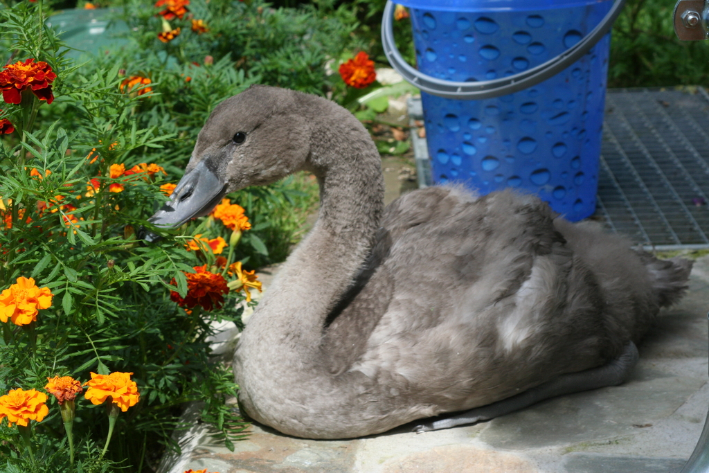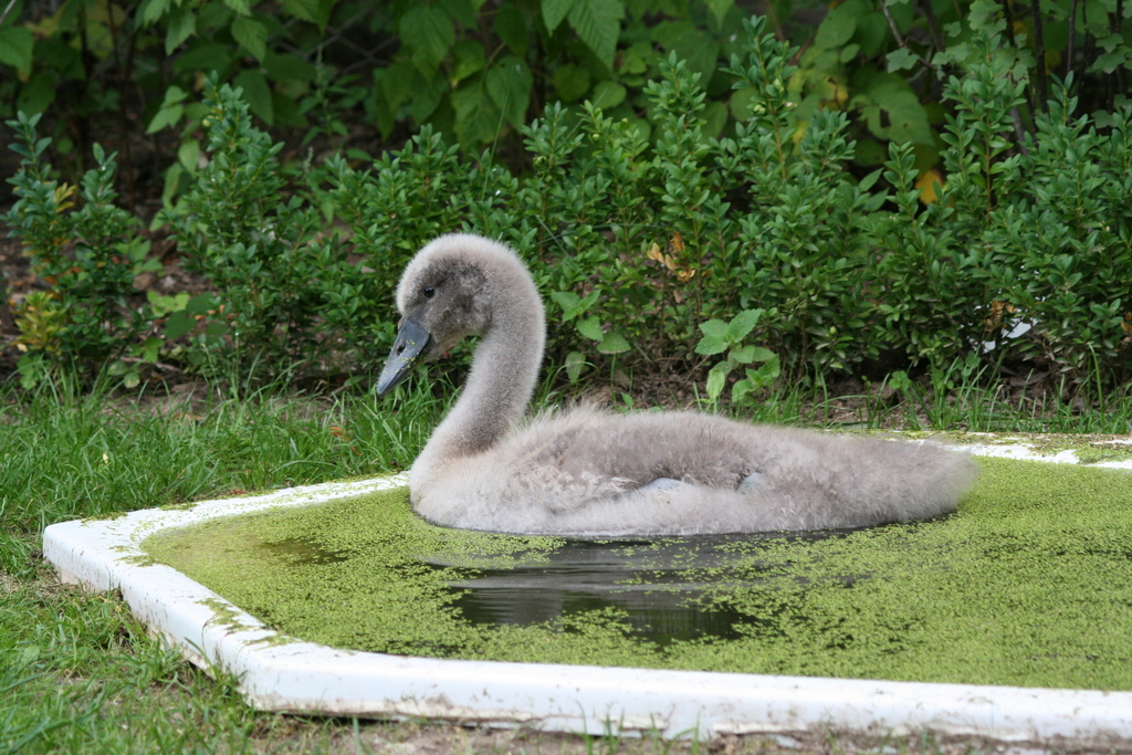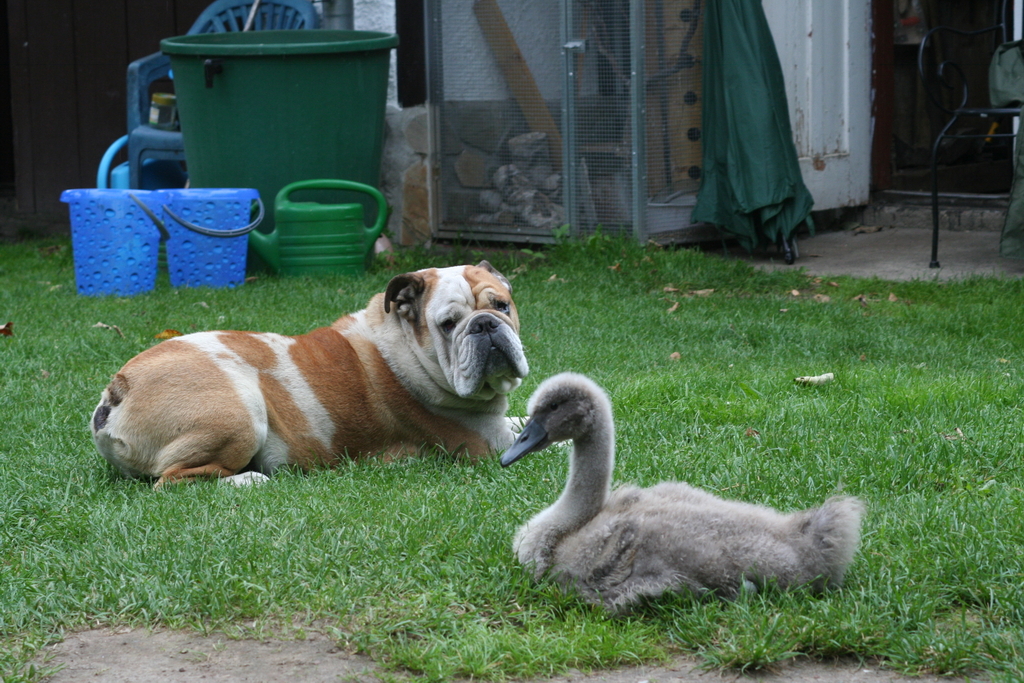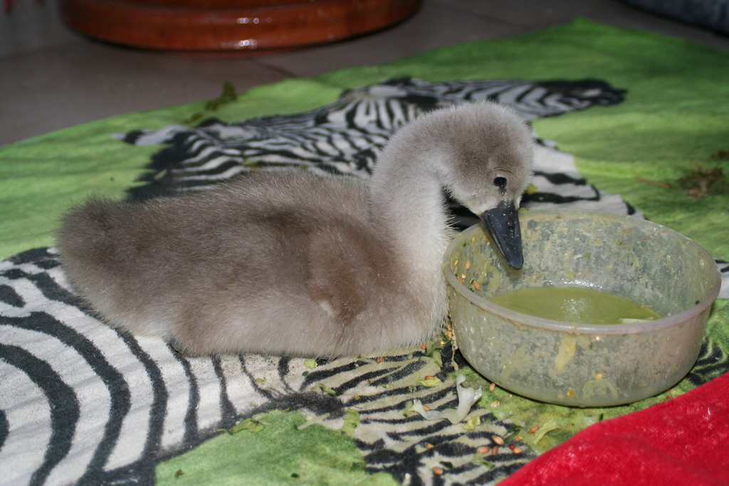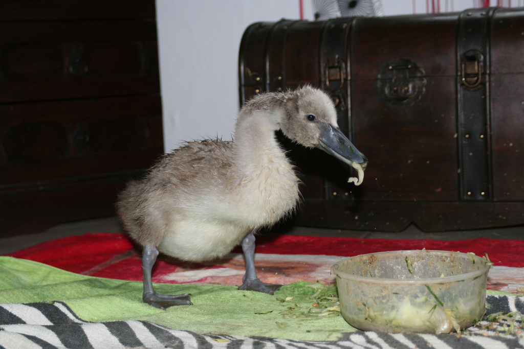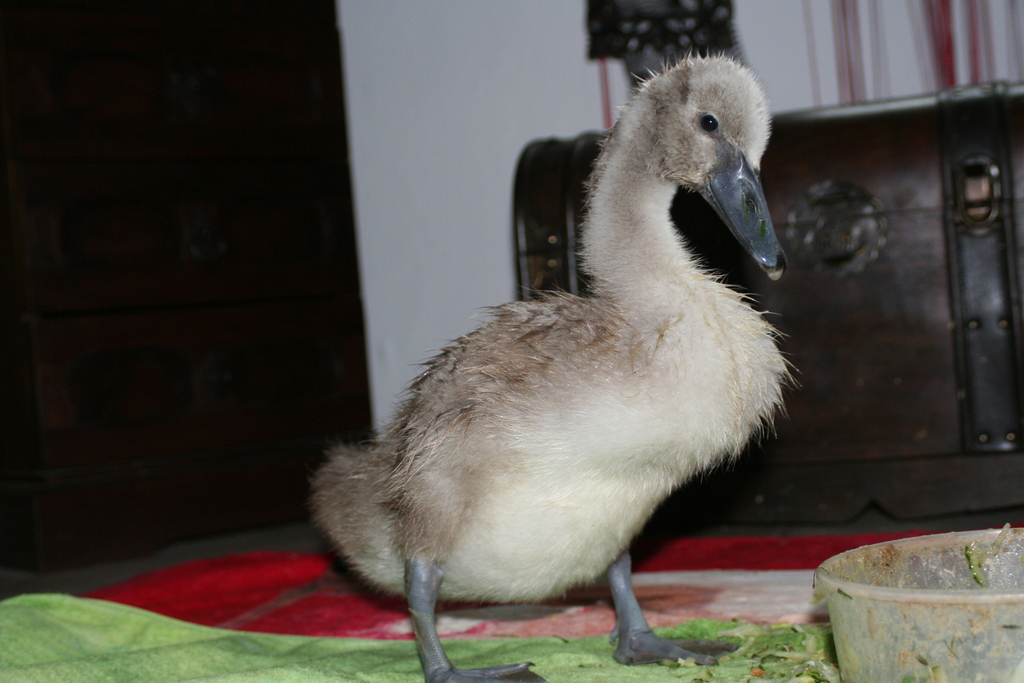 Ich bin eine Schwanendame. Die Vogelfrau brachte mich in die Praxis als frisch geschlüpftes Schwanenküken mit einer schweren Kopfverletzung. Wer mir das angetan hat, weiß ich nicht mehr. Ich wurde von einem Mann gefunden, der mich dann zur Vogelfrau gebracht hat. Sie taufte mich auf den Namen „…“ und brachte mich zu Swetlana Hempel. Ich war sehr lange krank und durch meine Kopfverletzung konnte ich auch lange Zeit mein Schwanenumfeld nicht wahrnehmen. Frau Hempel aber gab mich nicht auf. Sie stopfte mir Futter in den Kropf und reinigte jeden Tag meine Wunde. Und irgendwie habe ich es geschafft, dann doch ein schöner Schwan zu werden. Ich bekam meinen eigenen Pool – weil ich ja ein Wasservogel bin. Das war eine Badewanne vom Schrottplatz, die vorm Fenster von Swetlanas Freund eingebuddelt wurde, sodass er mich immer sehen und notfalls vorm Fuchs und vor Greifvögeln schützen konnte. Dazu bekam ich noch meinen eigenen Bodyguard, die Englische Bulldogge Gustav. Er ist den ganzen Sommer über zuhause geblieben und hat auf mich aufgepasst, worauf sein bester Freund, Donald Duck II., ziemlich sauer reagiert hat, weil er jeden Tag alleine mit zur Arbeit in die Tierarztpraxis fahren musste. Deshalb konnte er es nicht lassen, mich aus Eifersucht zu kneifen und nach mir zu hacken, wann immer er konnte. Jeden Tag bekam ich zwei Liter Entengrütze, die extra für mich aus dem Teich gefischt wurde, denn das wurde als sehr wichtig für meine Schwanenentwicklung angesehen, dazu noch 4 geraspelte Gurken, einen kleingeschnittenen Kopf Salat und Enten-Kuchen-Pellets. So ist aus mir, dem „hässlichen Entlein“ schließlich eine wunderschöne Schwanendame geworden. Jetzt lebe ich mit anderen Jungschwänen im Tierpark, und wir freuen uns auf den Frühling. Da werden wir alle in einen großen Teich kommen und – anfangs noch unter Aufsicht – und Wildleben beginnen.