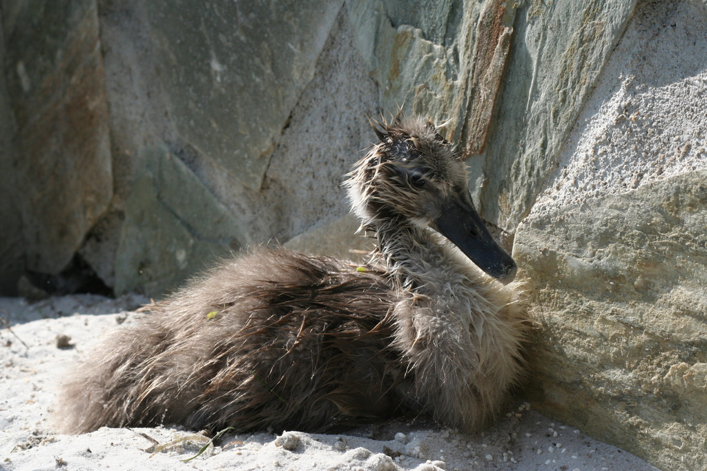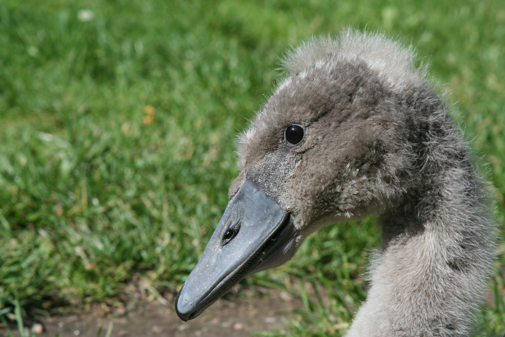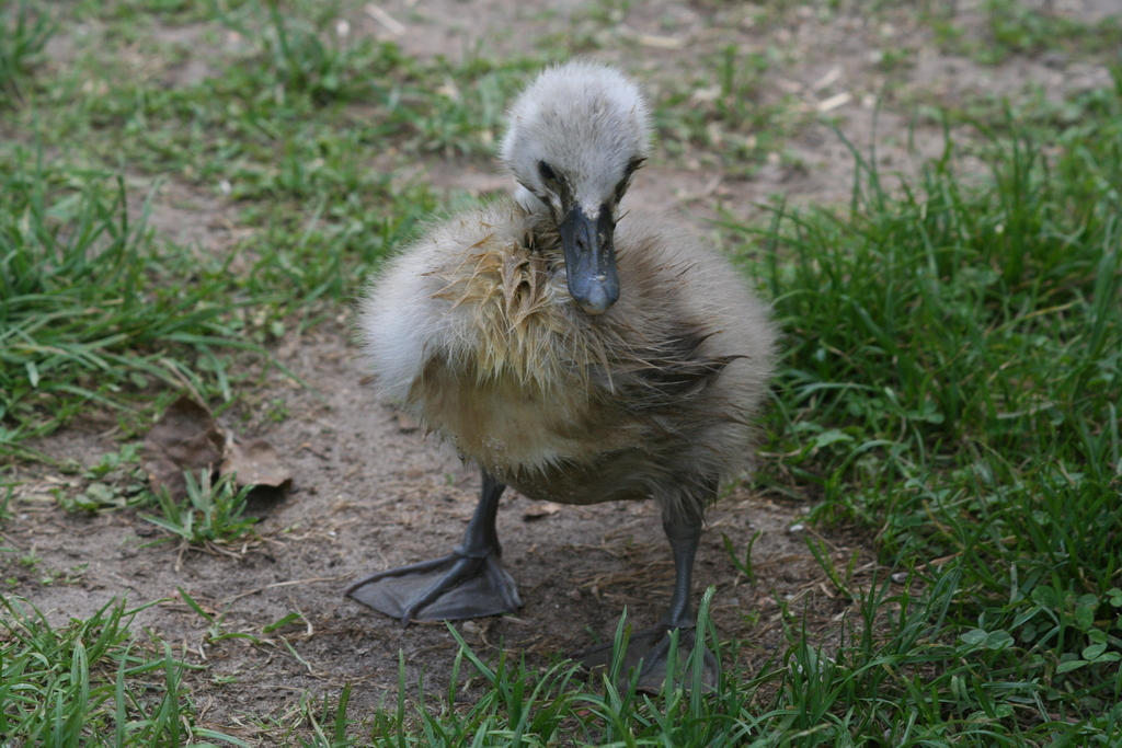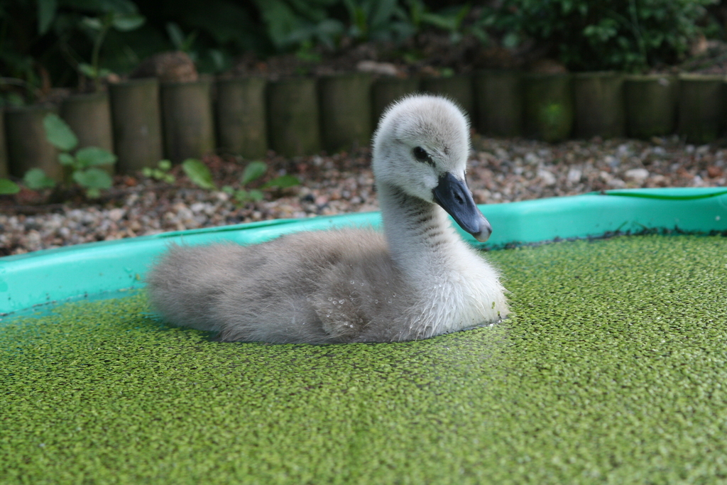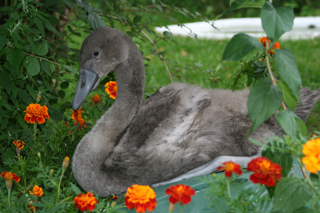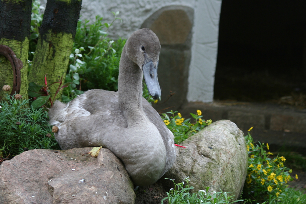 Ich bin eine Schwanendame. Die Vogelfrau brachte mich in die Praxis als frisch geschlüpftes Schwanenküken mit einer schweren Kopfverletzung. Wer mir das angetan hat, weiß ich nicht mehr. Ich wurde von einem Mann gefunden, der mich dann zur Vogelfrau gebracht hat. Sie taufte mich auf den Namen „…“ und brachte mich zu Swetlana Hempel. Ich war sehr lange krank und durch meine Kopfverletzung konnte ich auch lange Zeit mein Schwanenumfeld nicht wahrnehmen. Frau Hempel aber gab mich nicht auf. Sie stopfte mir Futter in den Kropf und reinigte jeden Tag meine Wunde. Und irgendwie habe ich es geschafft, dann doch ein schöner Schwan zu werden. Ich bekam meinen eigenen Pool – weil ich ja ein Wasservogel bin. Das war eine Badewanne vom Schrottplatz, die vorm Fenster von Swetlanas Freund eingebuddelt wurde, sodass er mich immer sehen und notfalls vorm Fuchs und vor Greifvögeln schützen konnte. Dazu bekam ich noch meinen eigenen Bodyguard, die Englische Bulldogge Gustav. Er ist den ganzen Sommer über zuhause geblieben und hat auf mich aufgepasst, worauf sein bester Freund, Donald Duck II., ziemlich sauer reagiert hat, weil er jeden Tag alleine mit zur Arbeit in die Tierarztpraxis fahren musste. Deshalb konnte er es nicht lassen, mich aus Eifersucht zu kneifen und nach mir zu hacken, wann immer er konnte. Jeden Tag bekam ich zwei Liter Entengrütze, die extra für mich aus dem Teich gefischt wurde, denn das wurde als sehr wichtig für meine Schwanenentwicklung angesehen, dazu noch 4 geraspelte Gurken, einen kleingeschnittenen Kopf Salat und Enten-Kuchen-Pellets. So ist aus mir, dem „hässlichen Entlein“ schließlich eine wunderschöne Schwanendame geworden. Jetzt lebe ich mit anderen Jungschwänen im Tierpark, und wir freuen uns auf den Frühling. Da werden wir alle in einen großen Teich kommen und – anfangs noch unter Aufsicht – und Wildleben beginnen.
