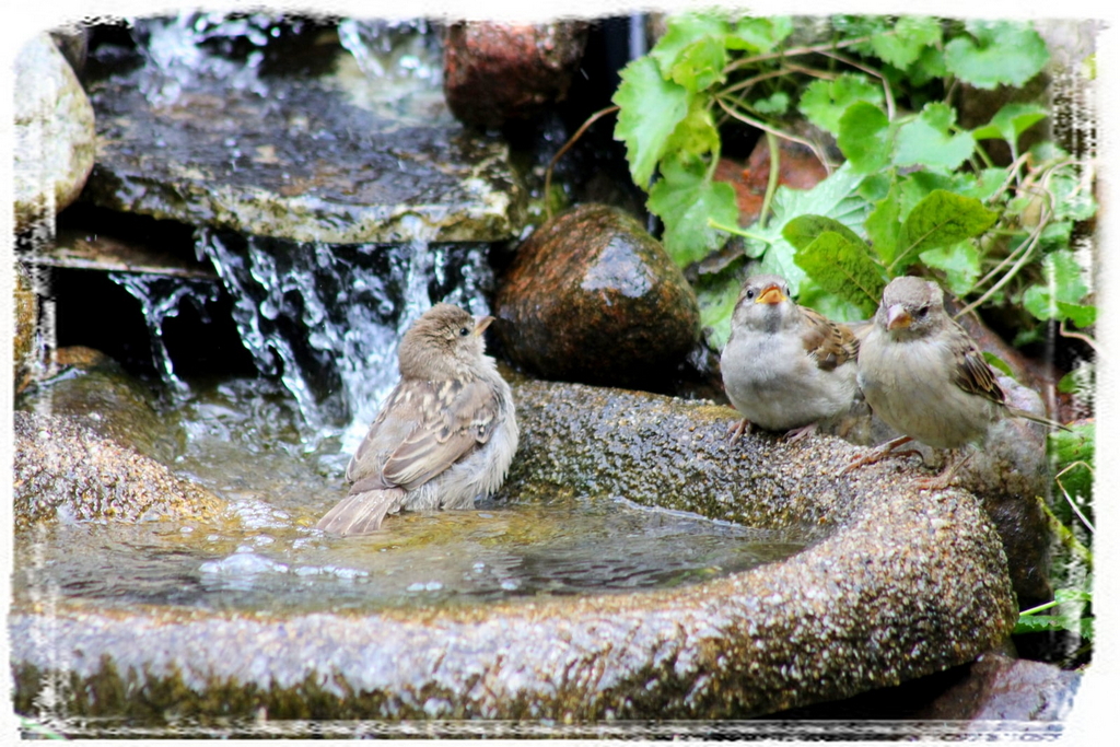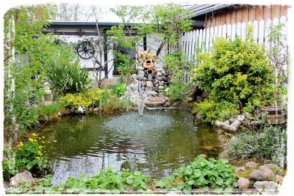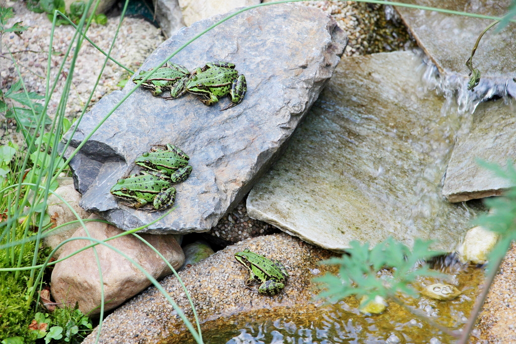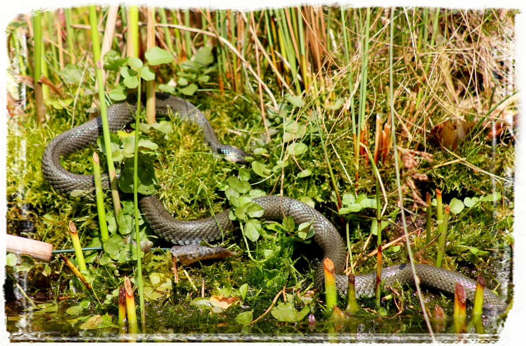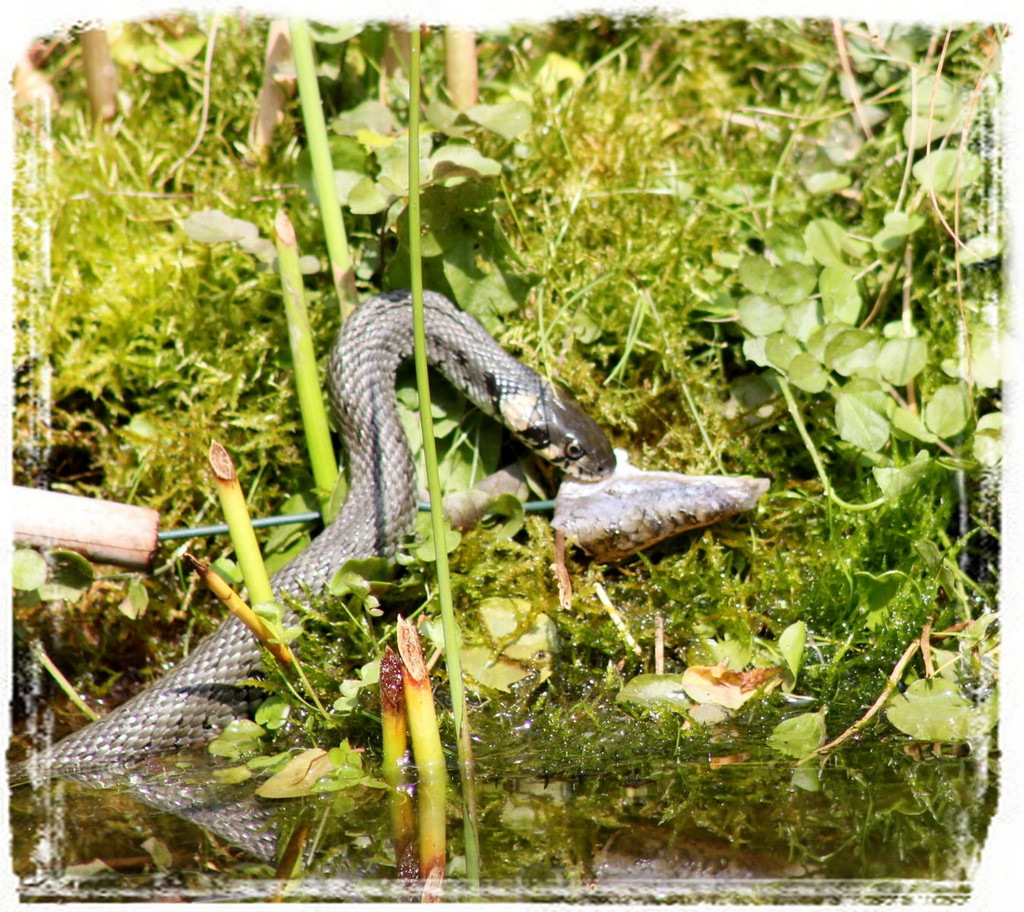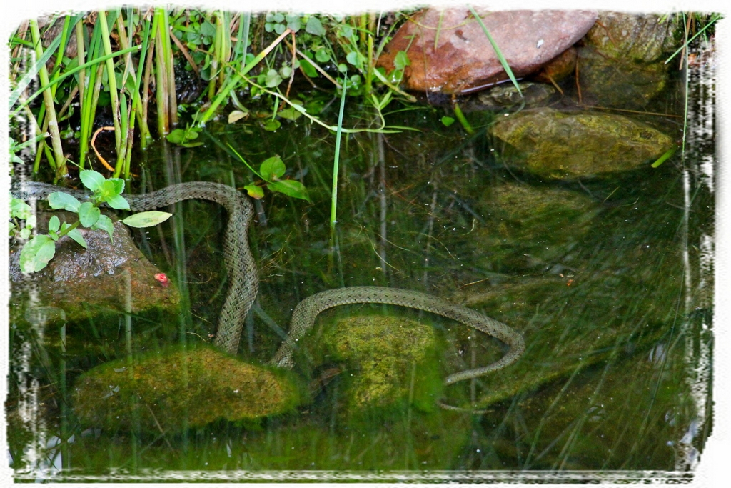 Das ewige Drama im Garten ist der Teich. Einen Teich zu haben, ist - abgesehen von viel Arbeit und Pflege - wunderschön, besonders an heißen Tagen. Jedoch nicht, wenn in diesem Teich auch noch eine Schlange wohnt. Sie war irgendwann einfach da und bekam von mir den Namen Peter. Dann begannen die Fische zu verschwinden, die Frösche, schließlich auch die Eier von wilden Enten, die auch bei mir zuhause sind. Und wenn Peter Hunger hatte, versuchte er, selbst mich anzugreifen. Nach ein paar Jahren sind wir trotzdem Freunde geworden. Er lässt die Fische und Frösche in Ruhe, wenn ich ihm dafür ab und zu ein paar Tiefkühl-Fische bringe, die er sehr gerne nimmt. Vermutlich war Peter jedoch die ganze Zeit eine Petra, denn eines Tages war der ganzen Garten voll mit Babyschlangen!
