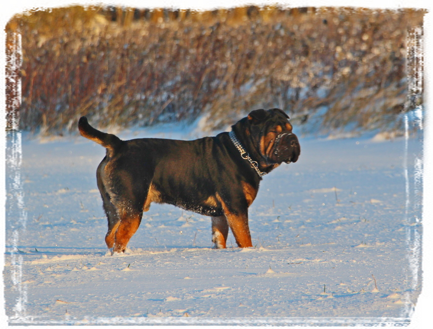 Ich bin Bodyguard. Und ich bin Bull-Pei Nummer zwei. Ich bin ein Jahr alt und ein kleiner Bandit, ein Mix aus Englischer Bulldogge und Shar Pei. Ich komme aus Sachsen und wohne in Brandenburg, fahre aber jeden Tag zur Arbeit nach Berlin! Frauchen denkt, ich wäre ein Jack Russel. Ich werde nie müde! Ich kann den ganzen Tag lang toben und Party machen! Ich kann gut schwimmen. Ich springe wie eine Känguru! Ich habe eine sehr gute Nase und einen ausgeprägten Jagdinstinkt. Ich bin ein guter Wachhund und lasse niemanden ohne Erlaubnis meines Frauchen in den Garten. Mein Frauchen ist sehr anstrengend und wir haben oft Meinungsverschiedenheiten … und meistens (eigentlich immer) muss ich nachgeben! Unsere Katze Pati ist meine beste Freundin. Leider kann ich kann keine Bäume hochklettern, aber sonst jagen wir uns die ganze Zeit im Garten – wenn wir nicht gerade auf Arbeit sind, denn Pati fährt auch mit zur Arbeit. Da hilft sie mir, leere Kartons zu zerlegen.