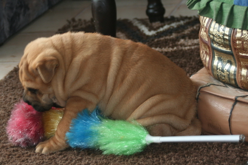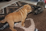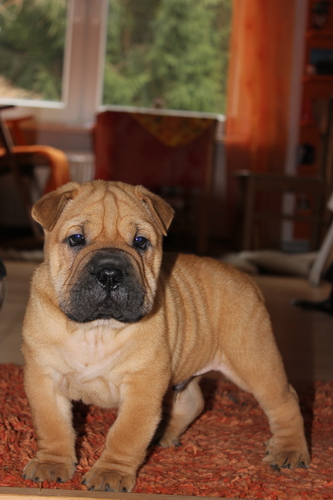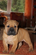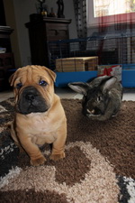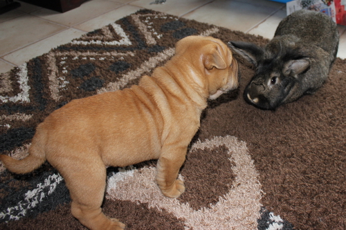 Ach ja, ich habe ganz vergessen, mich vorzustellen: Ich bin jetzt 10 Wochen alt und ein Bull-Pei … Ein was?, fragen Sie? ... Ein Bull-Pei entsteht, wenn eine reinrassige Shar Pei-Dame mit einem Bulldoggen-Herrn fremdgeht. Das Resultat bin ich! – Meine Pflegefamilie ist cool. Ein bisschen blöd ist es, dass ich nicht alles darf ... Ich habe auch schon die Kaninchen kennengelernt und wollte sie natürlich sofort jagen. Die Hühner zu jagen macht auch Spaß, weil die so gern wegflattern, und Katzen sind auch plem-plem ...