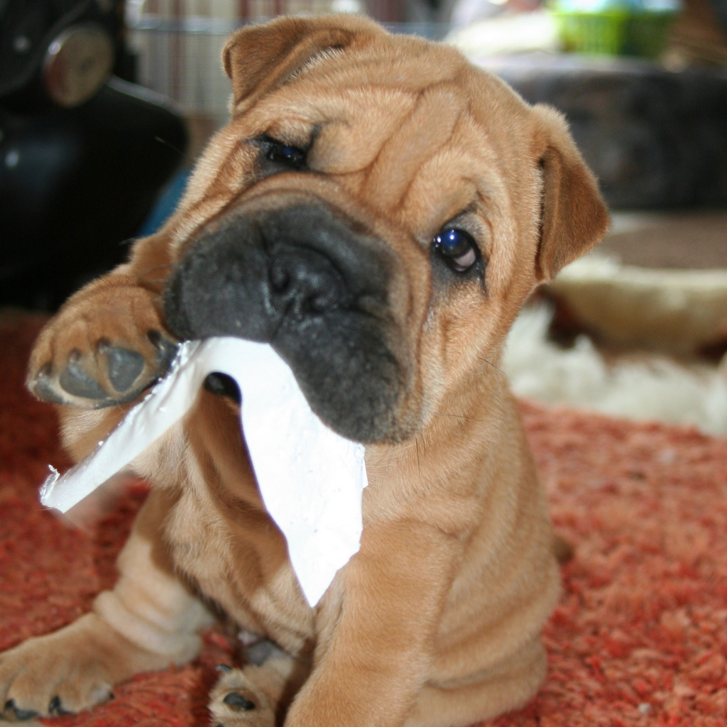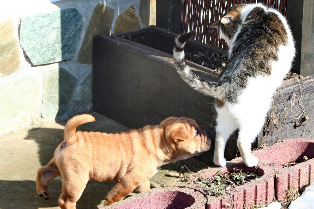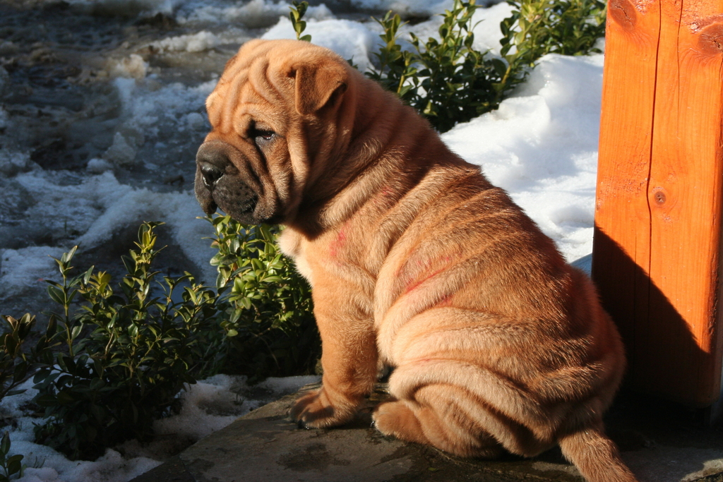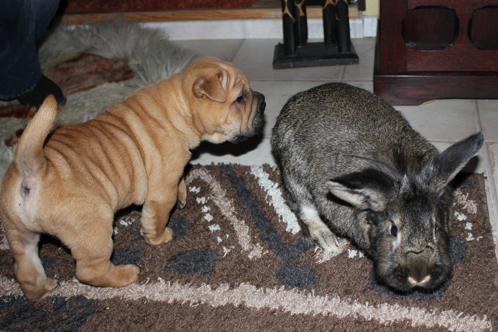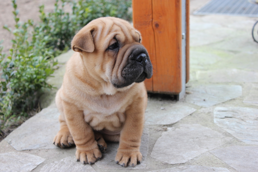 Ach ja, ich habe ganz vergessen, mich vorzustellen: Ich bin jetzt 10 Wochen alt und ein Bull-Pei … Ein was?, fragen Sie? ... Ein Bull-Pei entsteht, wenn eine reinrassige Shar Pei-Dame mit einem Bulldoggen-Herrn fremdgeht. Das Resultat bin ich! – Meine Pflegefamilie ist cool. Ein bisschen blöd ist es, dass ich nicht alles darf ... Ich habe auch schon die Kaninchen kennengelernt und wollte sie natürlich sofort jagen. Die Hühner zu jagen macht auch Spaß, weil die so gern wegflattern, und Katzen sind auch plem-plem ...