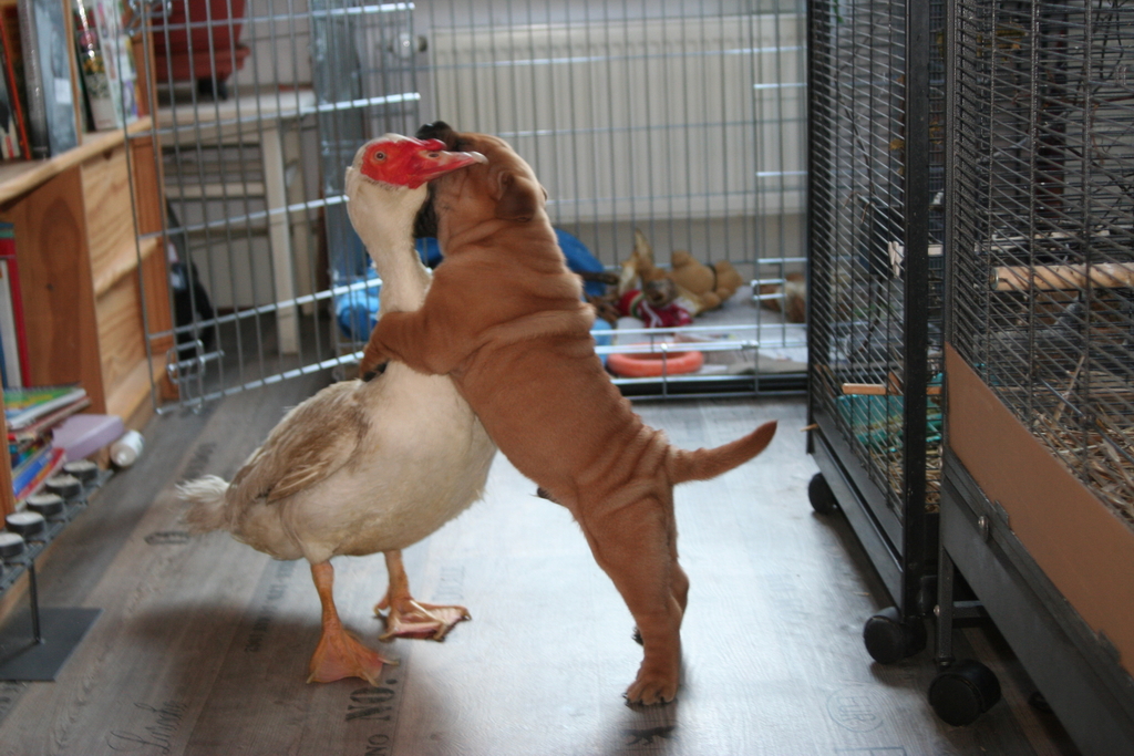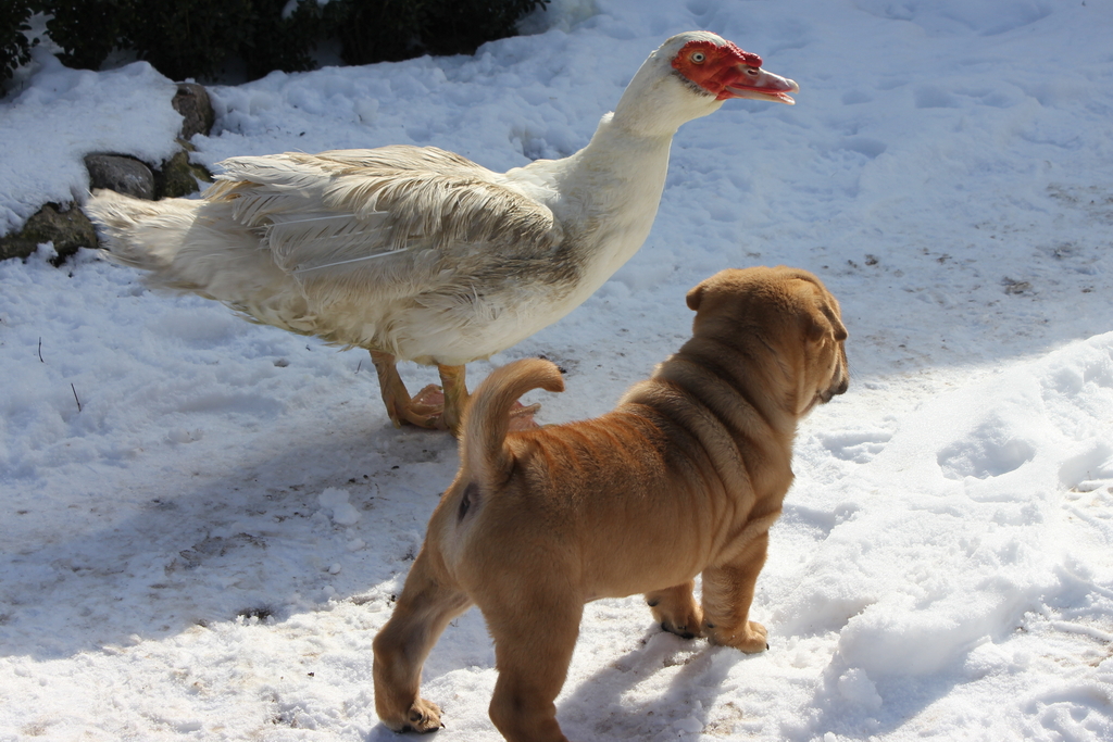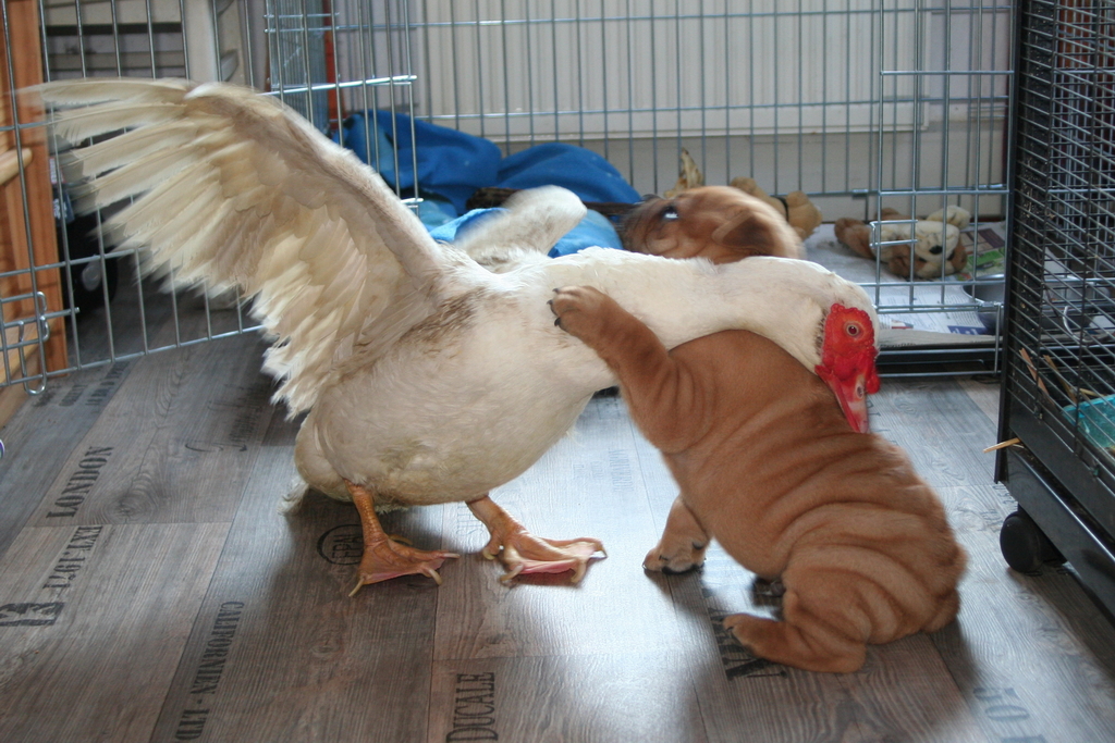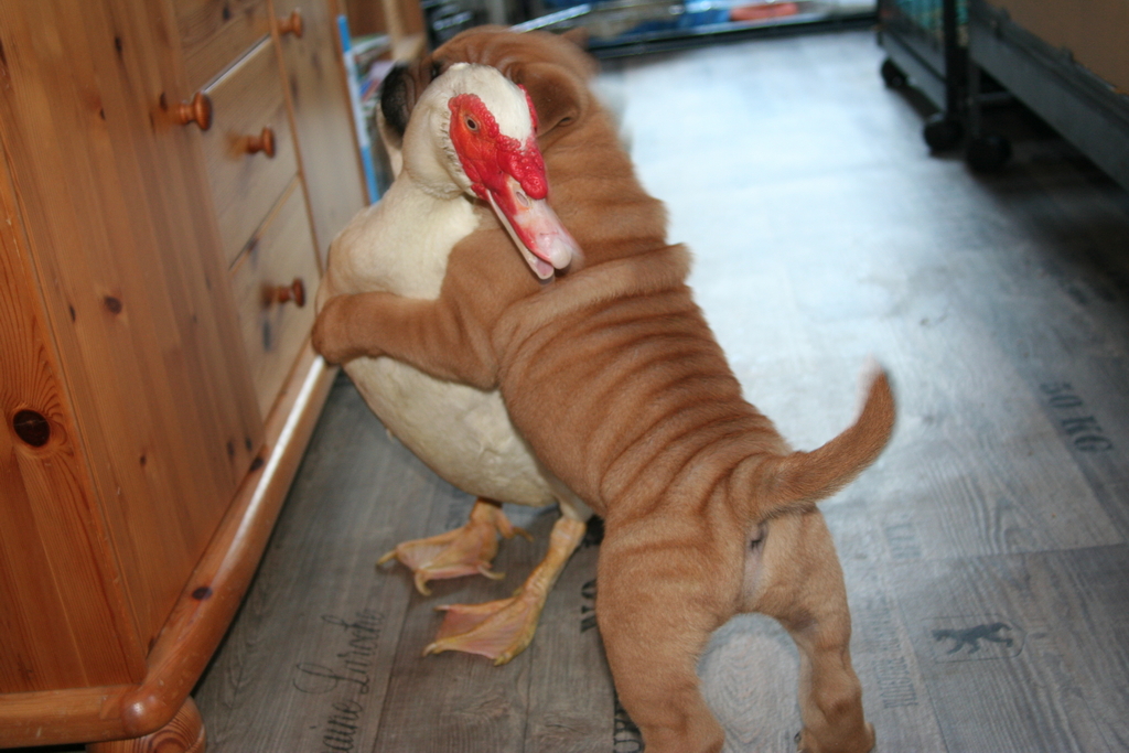 Ich bin der neue Enten-Kumpel, obwohl mir noch nicht ganz klar ist, ob die Ente nun Freund oder Feind ist. In den ersten Tagen näherten wir uns einander ganz vorsichtig unter Beobachtung von Frau Hempel. Dann ist irgendwann das Eis gebrochen und ich habe mit der Ente wie mit einem alten Kumpel getobt. Wir jagten durch den Garten, sprangen und balgten uns und machten einfach alles, was Spaß macht, aber schließlich hat die Ente mich so doll gekniffen, dass ich zurückschnappen musste! Jetzt dürfen wir nur noch miteinander toben, wenn Frau Hempel dabei ist.