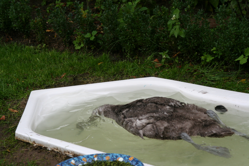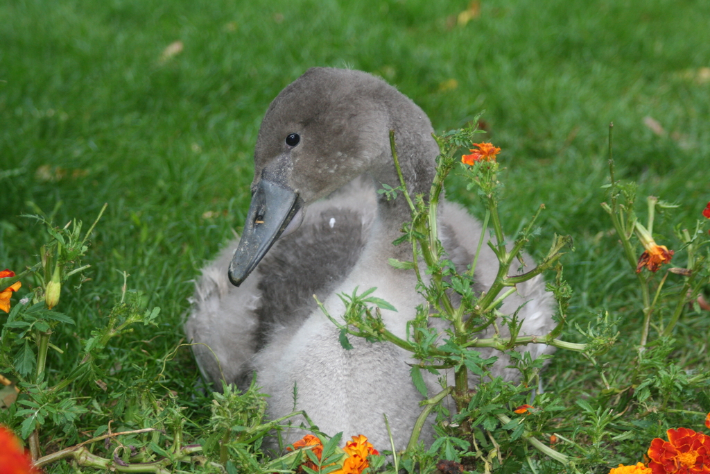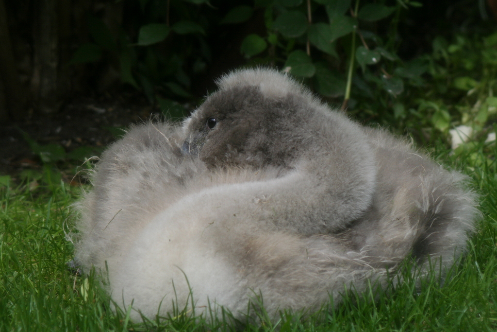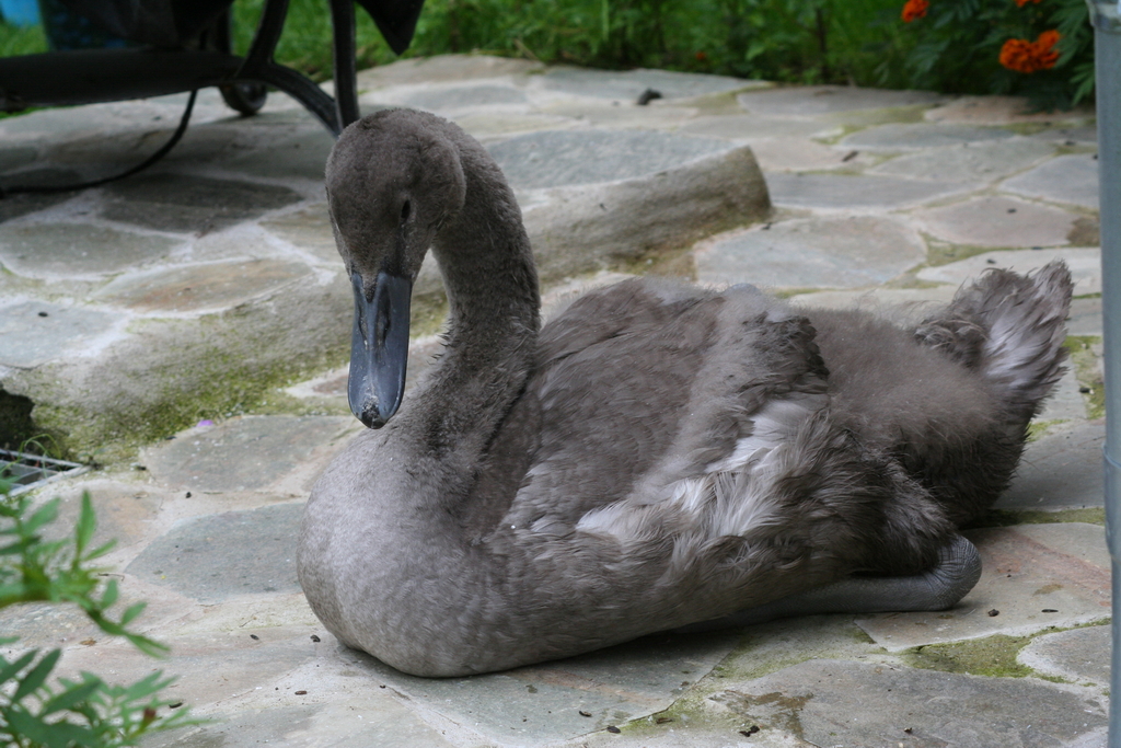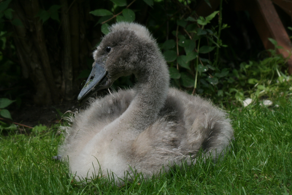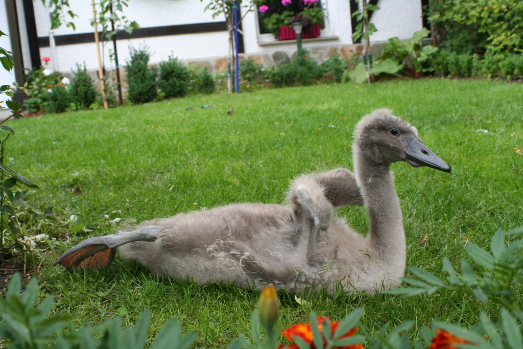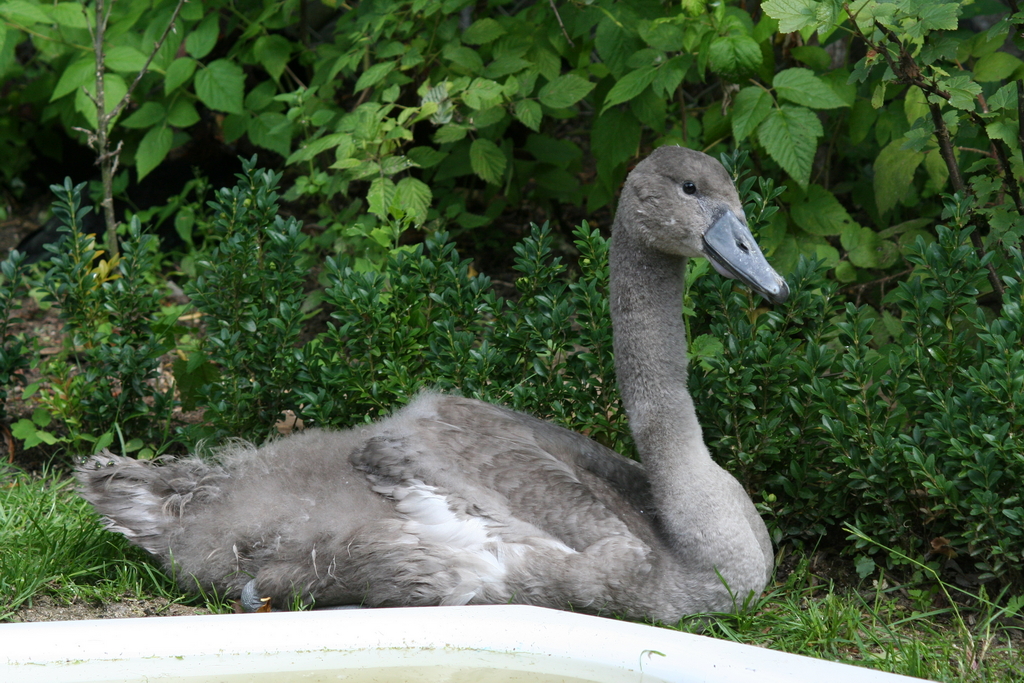 Ich bin eine Schwanendame. Die Vogelfrau brachte mich in die Praxis als frisch geschlüpftes Schwanenküken mit einer schweren Kopfverletzung. Wer mir das angetan hat, weiß ich nicht mehr. Ich wurde von einem Mann gefunden, der mich dann zur Vogelfrau gebracht hat. Sie taufte mich auf den Namen „…“ und brachte mich zu Swetlana Hempel. Ich war sehr lange krank und durch meine Kopfverletzung konnte ich auch lange Zeit mein Schwanenumfeld nicht wahrnehmen. Frau Hempel aber gab mich nicht auf. Sie stopfte mir Futter in den Kropf und reinigte jeden Tag meine Wunde. Und irgendwie habe ich es geschafft, dann doch ein schöner Schwan zu werden. Ich bekam meinen eigenen Pool – weil ich ja ein Wasservogel bin. Das war eine Badewanne vom Schrottplatz, die vorm Fenster von Swetlanas Freund eingebuddelt wurde, sodass er mich immer sehen und notfalls vorm Fuchs und vor Greifvögeln schützen konnte. Dazu bekam ich noch meinen eigenen Bodyguard, die Englische Bulldogge Gustav. Er ist den ganzen Sommer über zuhause geblieben und hat auf mich aufgepasst, worauf sein bester Freund, Donald Duck II., ziemlich sauer reagiert hat, weil er jeden Tag alleine mit zur Arbeit in die Tierarztpraxis fahren musste. Deshalb konnte er es nicht lassen, mich aus Eifersucht zu kneifen und nach mir zu hacken, wann immer er konnte. Jeden Tag bekam ich zwei Liter Entengrütze, die extra für mich aus dem Teich gefischt wurde, denn das wurde als sehr wichtig für meine Schwanenentwicklung angesehen, dazu noch 4 geraspelte Gurken, einen kleingeschnittenen Kopf Salat und Enten-Kuchen-Pellets. So ist aus mir, dem „hässlichen Entlein“ schließlich eine wunderschöne Schwanendame geworden. Jetzt lebe ich mit anderen Jungschwänen im Tierpark, und wir freuen uns auf den Frühling. Da werden wir alle in einen großen Teich kommen und – anfangs noch unter Aufsicht – und Wildleben beginnen.