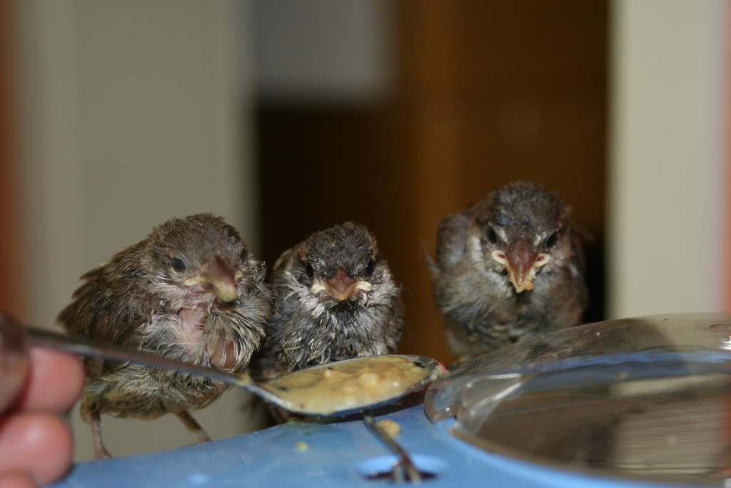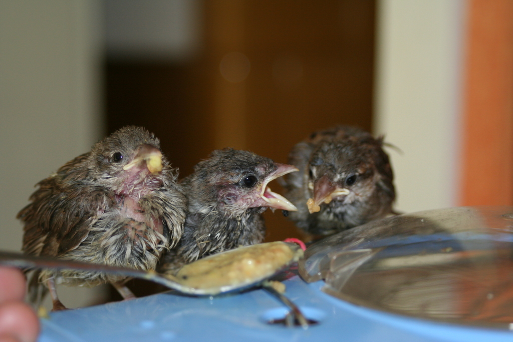 Aus allen Ecken Berlins und Brandenburgs werden uns vom Frühling bis spät in den Sommer hinein Spatzenbabys gebracht. „Gummibärchen“ nennen wir sie, wenn sie frisch geschlüpft und nackt bei uns ankommen. Ein jedes hat auf seine Weise seine Spatzenfamilie verloren. Wir ziehen sie in der Tierarztpraxis groß. Alle dreißig Minuten, von Sonnenaufgang bis Sonnenuntergang, müssen sie mit Eierbrei gefüttert werden. Sobald sie „futterfest“ sind und selbst fressen können, kommen sie in Spatzengruppen in eine Außenvoliere in Schöneiche. Dort bleibt dann stets ein Türchen offen, damit sie nach Gutdünken den Garten erkunden können. Solange sie möchten, können sie zum Essen und zum Schlafen wieder hinein. Aber irgendwann sind sie alle wieder Wildspatzen.