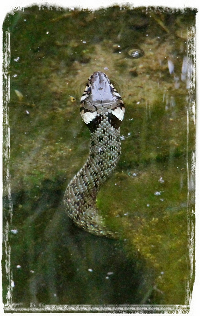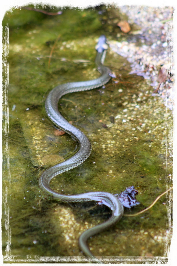 Das ewige Drama im Garten ist der Teich. Einen Teich zu haben, ist - abgesehen von viel Arbeit und Pflege - wunderschön, besonders an heißen Tagen. Jedoch nicht, wenn in diesem Teich auch noch eine Schlange wohnt. Sie war irgendwann einfach da und bekam von mir den Namen Peter. Dann begannen die Fische zu verschwinden, die Frösche, schließlich auch die Eier von wilden Enten, die auch bei mir zuhause sind. Und wenn Peter Hunger hatte, versuchte er, selbst mich anzugreifen. Nach ein paar Jahren sind wir trotzdem Freunde geworden. Er lässt die Fische und Frösche in Ruhe, wenn ich ihm dafür ab und zu ein paar Tiefkühl-Fische bringe, die er sehr gerne nimmt. Vermutlich war Peter jedoch die ganze Zeit eine Petra, denn eines Tages war der ganzen Garten voll mit Babyschlangen!