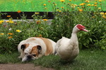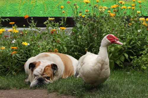 Ein sehr schmerzhaftes und trauriges Schicksal hat uns am 8. März 2013 ereilt. Der von uns allen geliebte Gustav, unsere zehnjährige Englische Bulldogge, musste uns für immer verlassen. Überraschend wurde er krank und hatte ein furchtbare Diagnose: einen fortgeschrittenen Herzbasistumor, der bereits auf Lunge, Leber und Knochen übergegriffen hatte. Er ließ seinen besten Freund, die Warzenente Mr Donald Duck, zurück, der ganze Tage aufgeplustert herumsaß und weder essen noch trinken wollte. Trotz unserer tiefen Trauer mussten wir rasch einen Nachfolger finden, ein neuer Kumpel für Donald Duck musste her! – Doch wie war das zu bewerkstelligen, woher eine ausgewachsene Bulldogge nehmen? – Und dann die Frage: Würde sich der neue Hund mit einer Ente anfreunden wollen? Und die Ente mit ihm? – Nach einigem Hin und Her trafen wir die Entscheidung, einen Bulldoggen-Welpen zu suchen. Weil wir viele andere Tiere haben, an die sich der Neuzugang würde gewöhnen müssen, war so die Chance am größten, dass alles harmonisch ablaufen würde. Also sind wir zu einer Züchterin gefahren ...